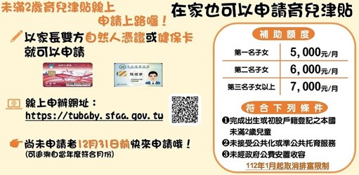 (請注意:請提供郵局帳戶,但若兒童戶籍地為臺北市,則可使用臺北富邦銀行) - 兒童為第2名以上子女證明文件。