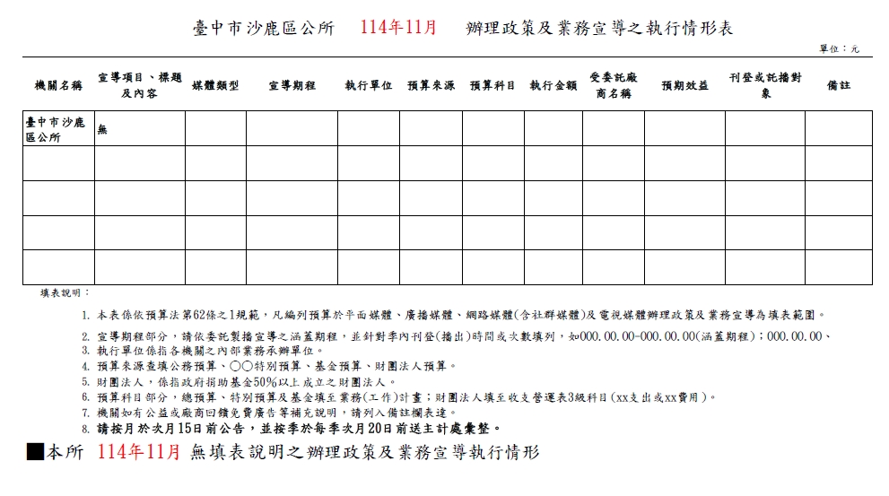 本所辦理預算法第62條之1第1項政策及業務宣導之預算,應就其執行情形加強管理,經調查結果本所114年11月份無應填報事項。