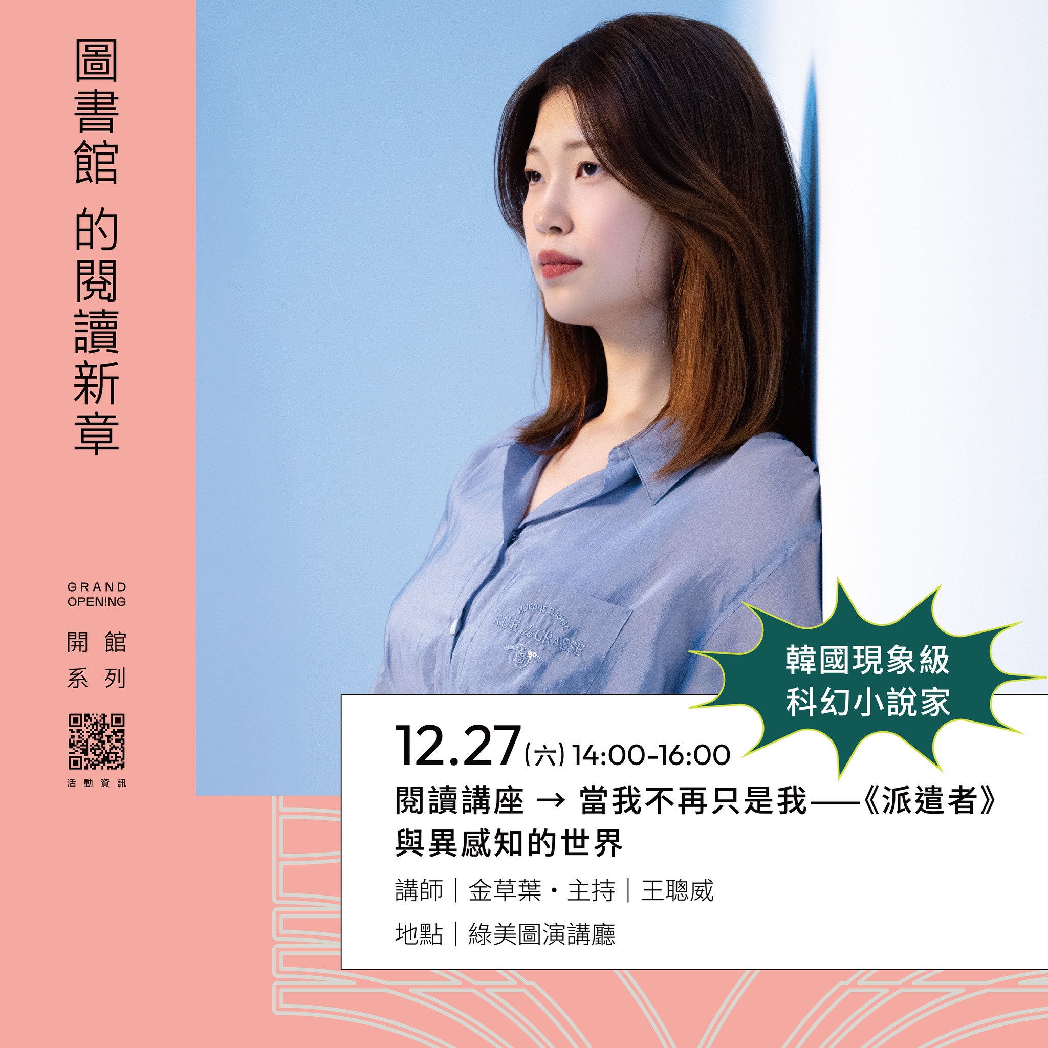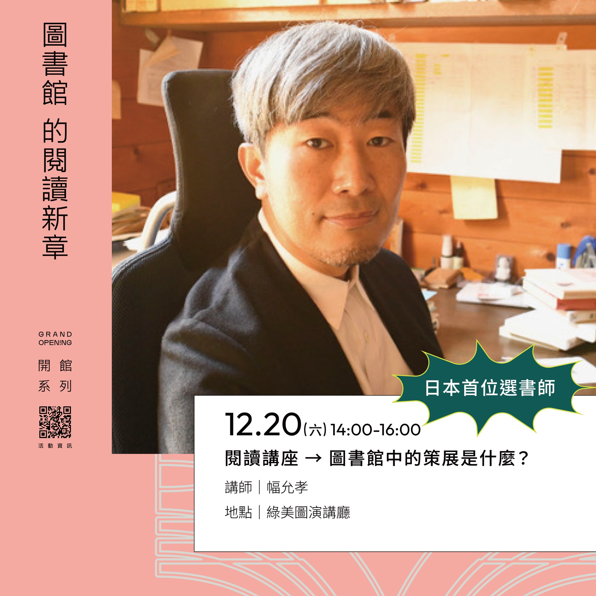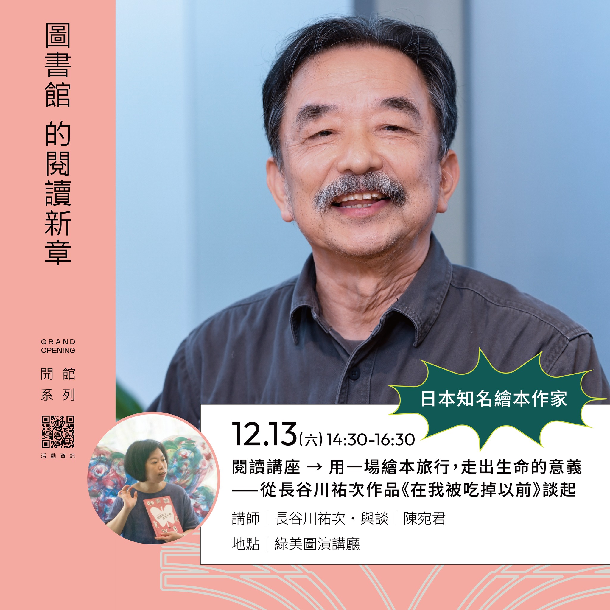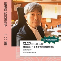 二、 本館精心規劃三場國際講座,邀請日本與韓國三位重量級講者——繪本作家長谷川祐次、日本首位「選書師」幅允孝,以及韓國科幻文學新星金草葉——於開館期間接力登場。三位講者將以跨文化視角,分別就生命、閱讀與未來等主題進行分享,期望為市民開啟一場深度且充滿想像力的閱讀饗宴。