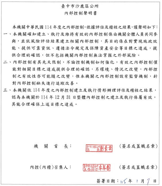 114年臺中市沙鹿區公所內部控制聲明書