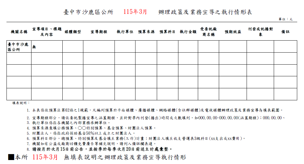 本所辦理預算法第62條之1第1項政策及業務宣導之預算,應就其執行情形加強管理,經調查結果本所115年3月份無應填報事項。