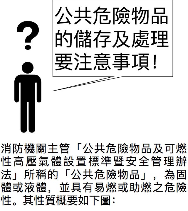 消防機關主管「公共危險物品及可燃性高壓氣體設置標準暨安全管理辦法」所稱的「公共危險物品」,為固體或液體,並具有易燃或助燃之危險性。其性質概要如下: