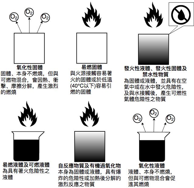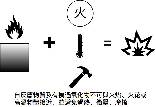 注意事項:自反應物質及有機過氧化物不可與火焰、火花或高溫物體接近,並避免過熱、衝擊、摩擦。