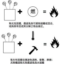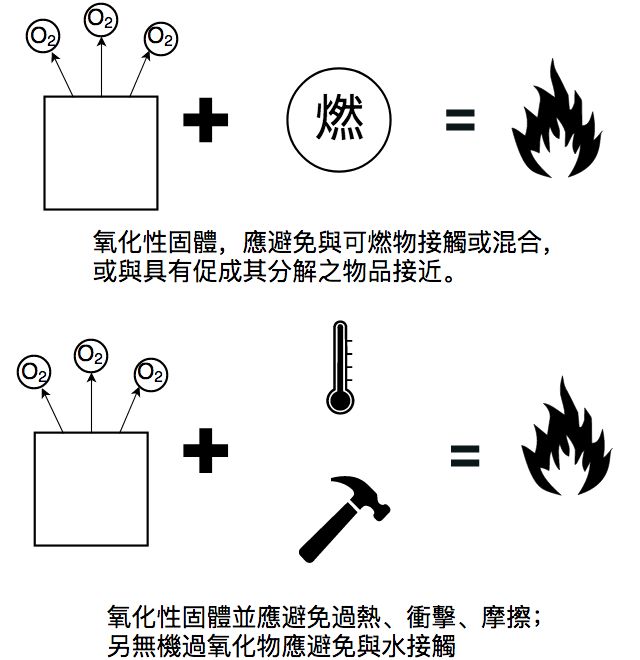 2. 並應避免過熱、衝擊、摩擦;另無機過氧化物應避免與水接觸。